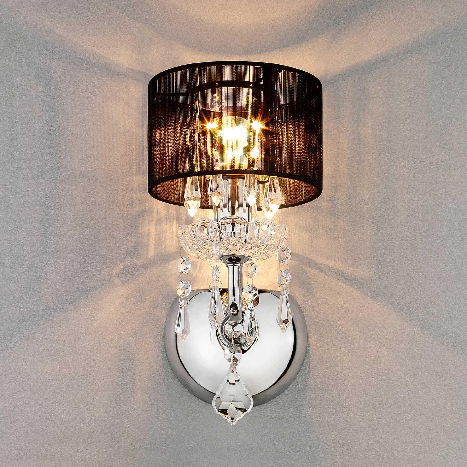Настенное бра Eurosvet Allata 2045/1 хром/черный от Eurosvet, подходит для гостиной, для спальни, в стиле современный, хрусталь. Материал — металл, цвет черный, плафон из нить, цвет плафона чёрный, форма плафона — цилиндр. Модель имеет 1 лампу, цоколь E14, мощность 60 Вт. Габариты: высота 270 мм, ширина 200 мм. Декор — хрустальные подвески, коллекция Allata, бра — С абажурами, бра — Подвески.