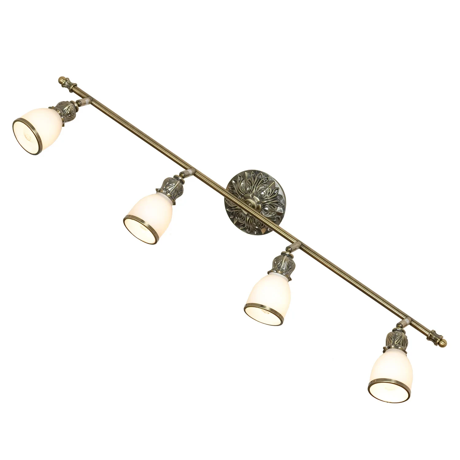 Светильник спот Lussole Furlo LSL-7309-04 от Lussole, в стиле классика. Материал — металл, цвет бронза, плафон из стекло, цвет плафона бронза. Модель имеет 4 лампы, цоколь E14. Габариты: высота 120 мм, ширина 850 мм. Споты — Поворотные, споты — Стеклянный плафон.