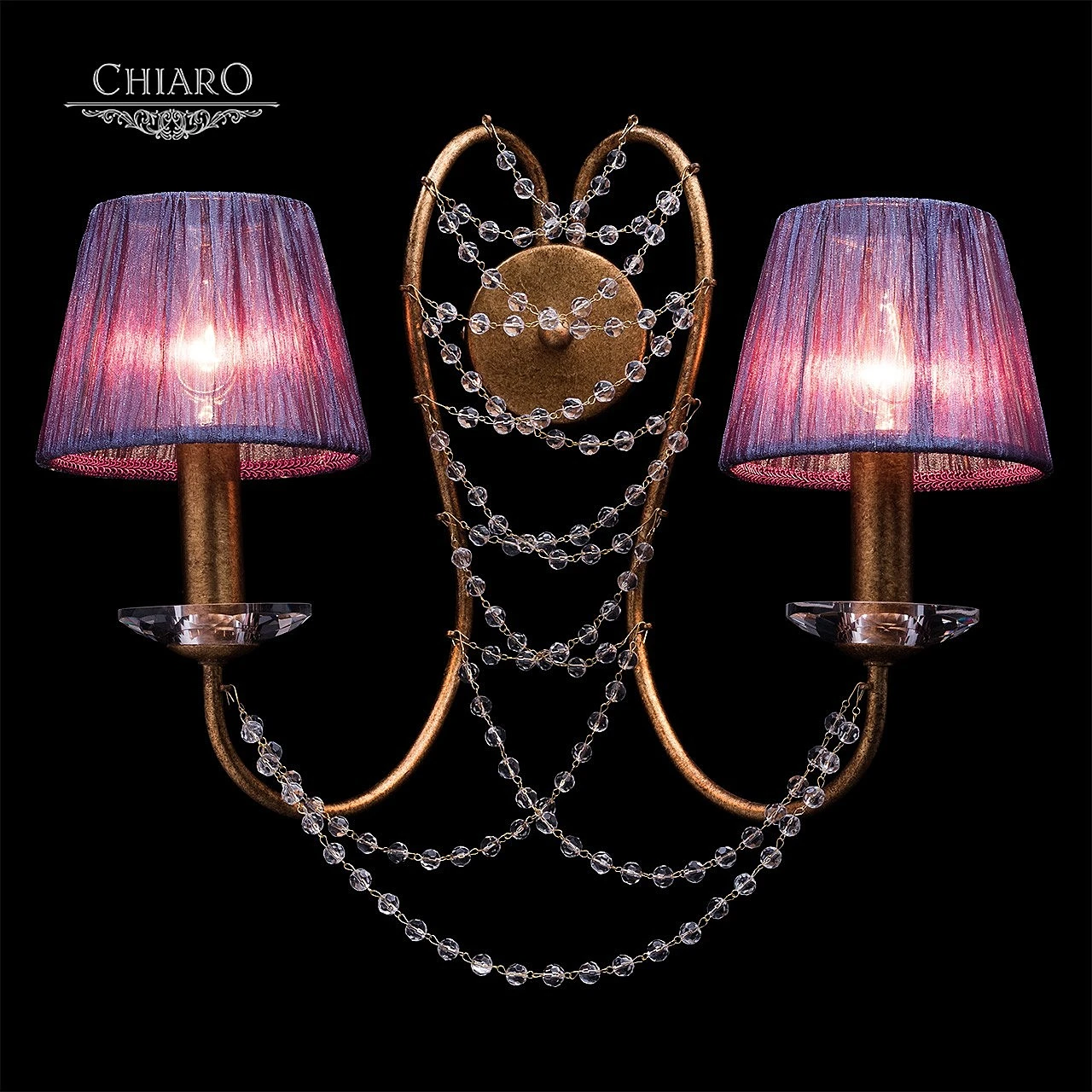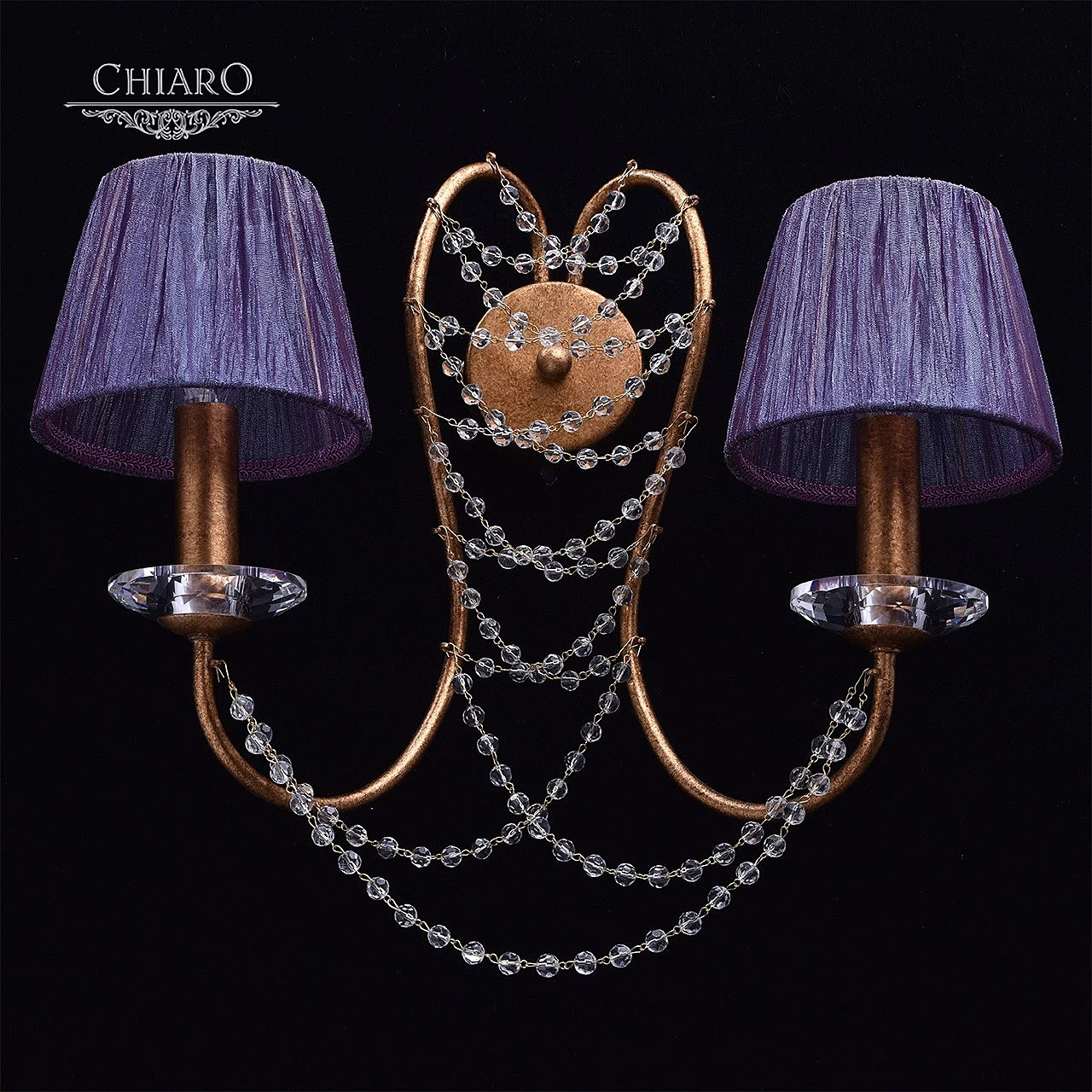 Настенно потолочный светильник Chiaro Валенсия 299021202 от Chiaro, подходит для гостиной, в стиле хрусталь. Материал — металл, цвет бронза, плафон из ткань, цвет плафона фиолетовый. Модель имеет 2 лампы, цоколь E14, мощность 80 Вт. Степень защиты IP20. Габариты: высота 400 мм, ширина 460 мм. Коллекция Валенсия.
